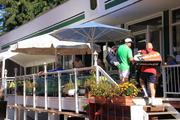 Vom gemütlichen und gastlichen Clubhaus gelangen Sie auf die bewirtete Terrasse und können hier im Sommer spannende Matches auf Platz 1 und 2 beobachten, oder einfach nur die Sonne genießen.
